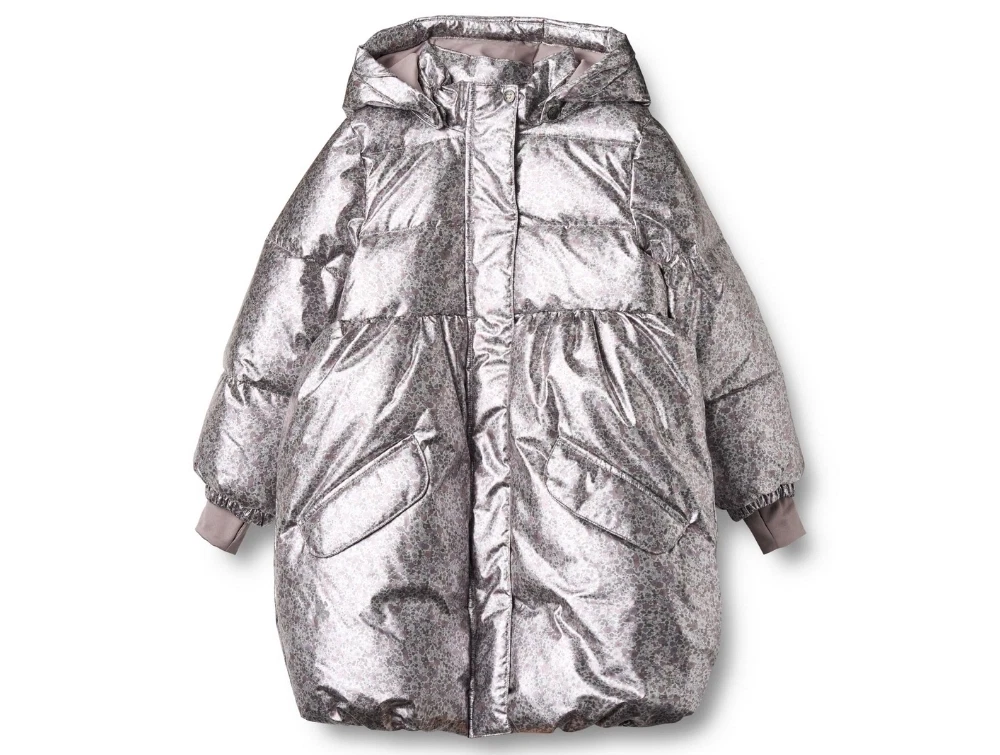 Lang pufferfrakke i sølvgrå nuance (silver flower meadow) fra Wheat med blomsterprint og metallisk overflade.