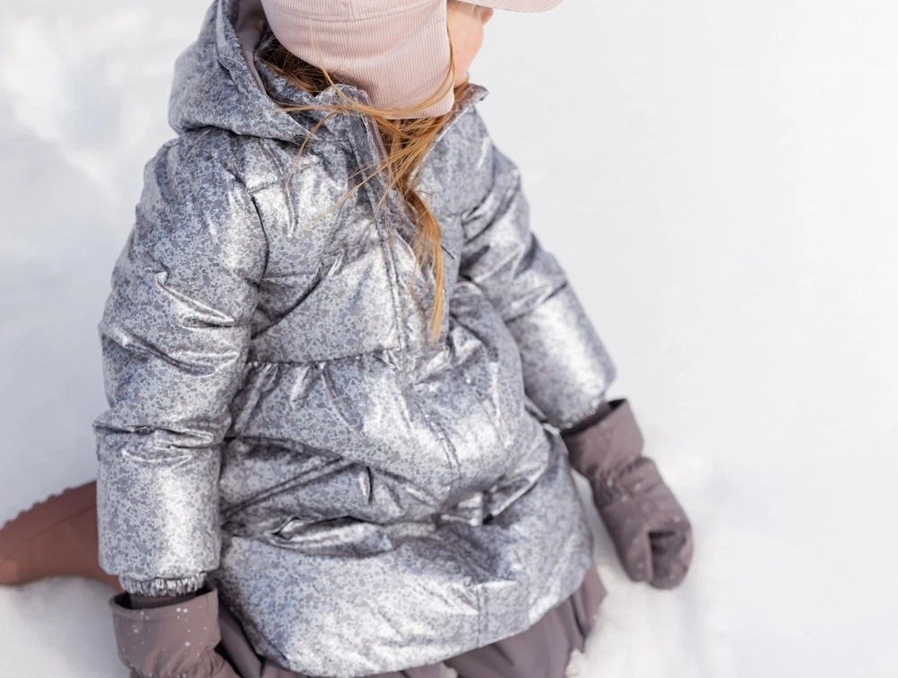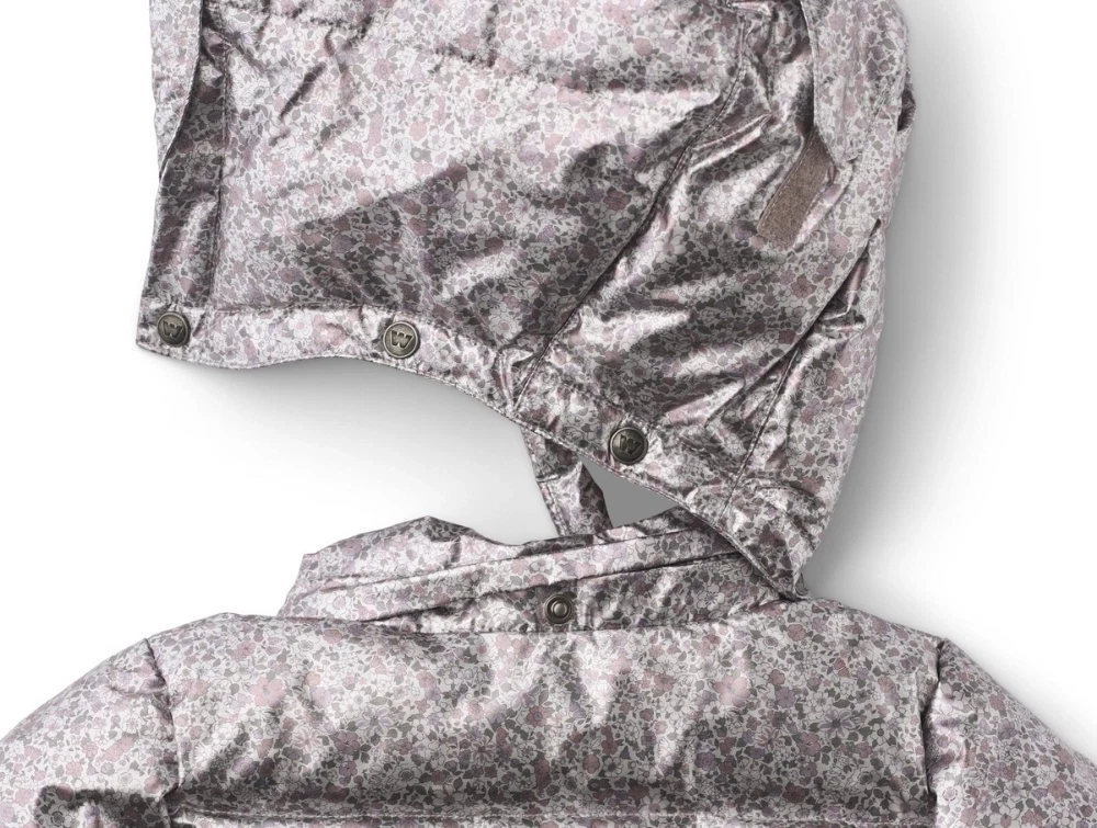 Wheat pufferfrakke i silver flower meadow set forfra med metallisk lookWheat pufferfrakke i silver flower meadow båret af barn i sneenWheat pufferfrakke i silver flower meadow åbnet og vist indefraWheat pufferfrakke i silver flower meadow set bagfraWheat pufferfrakke i silver flower meadow med aftagelig hætte