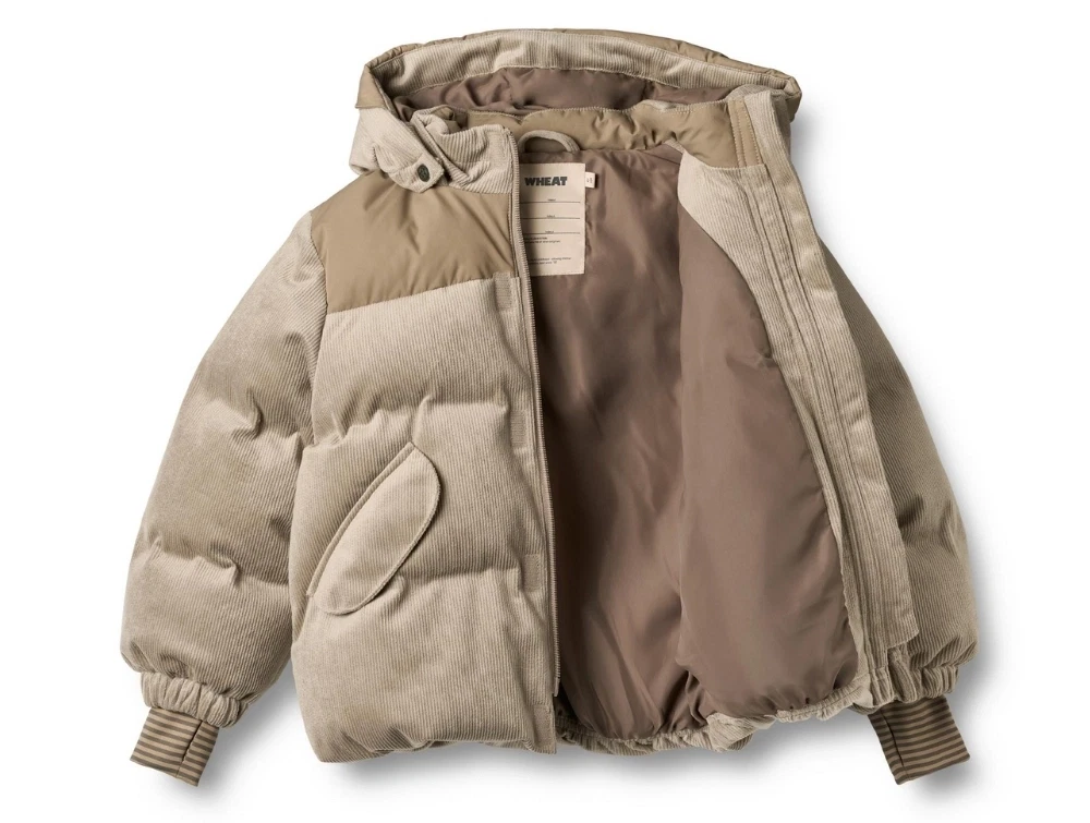 Pufferjakke i beige nuance (grey stone) fra Wheat med blød fløjlsoverflade og teknisk vattering, der giver varme og komfort.
