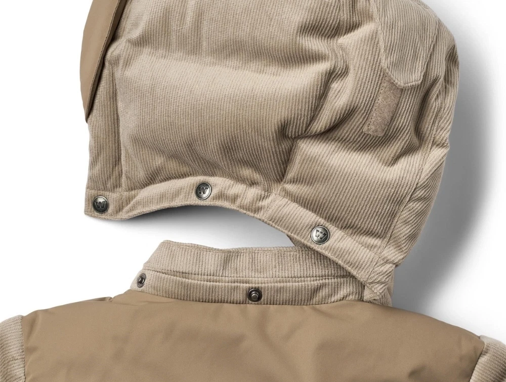 Jakken har en almindelig pasform og er designet i blød bredriflet fløjl. Den har en aftagelig og justerbar hætte, gennemgående lynlås med velcrolukning og skrålommer med klap og velcro. Ribmanchetter med hul til tommelfinger hjælper med at holde varmen inde. En diskret refleksdetalje bagpå øger synligheden.