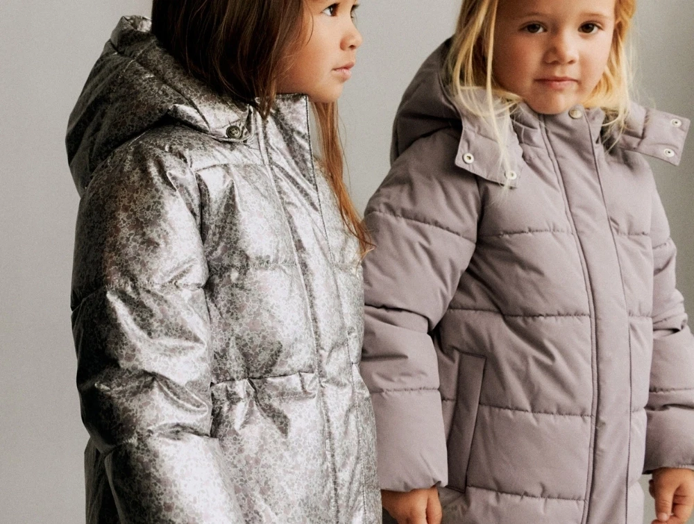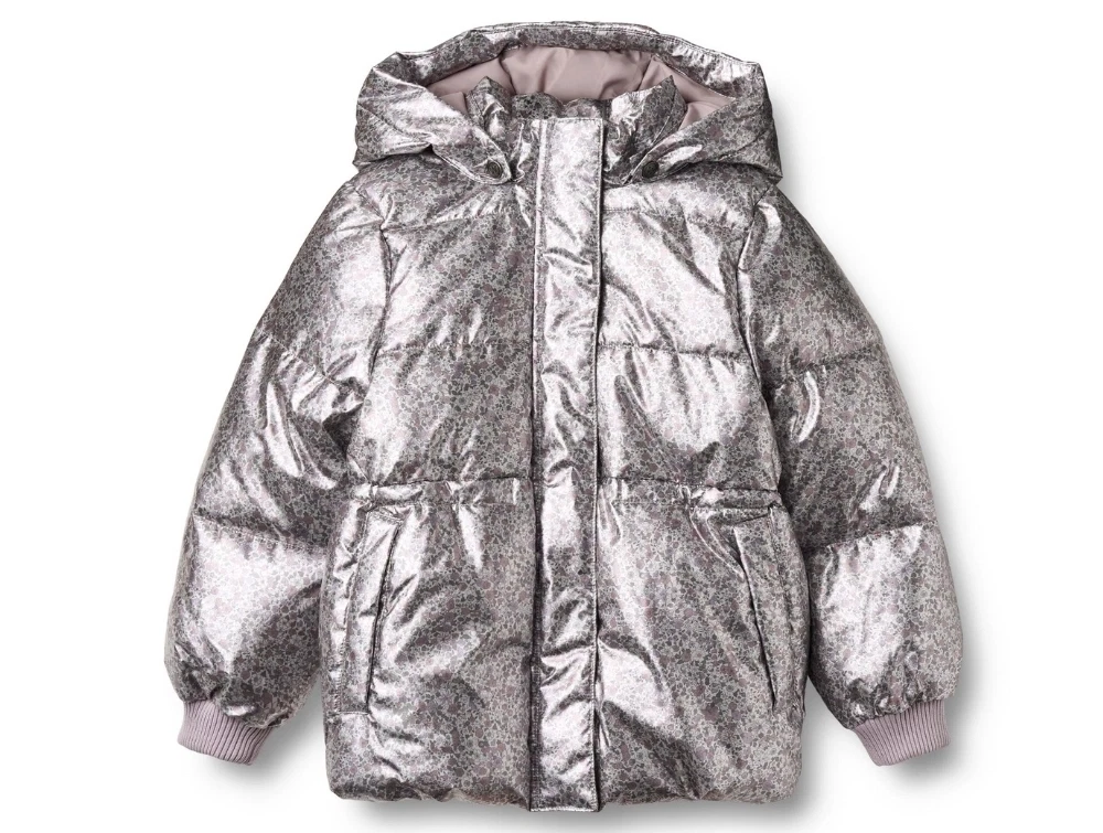 Pufferjakke i sølvgrå nuance (silver flower meadow) fra Wheat med blomsterprint og metallisk look.
