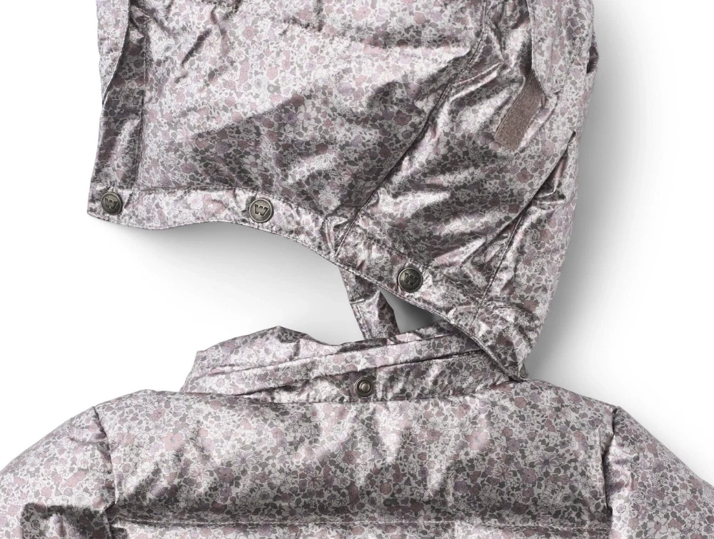 Wheat pufferjakke i silver flower meadow set forfra med metallisk lookWheat pufferjakke i silver flower meadow båret af barnWheat pufferjakke i silver flower meadow åbnet og vist indefraWheat pufferjakke i silver flower meadow set bagfraWheat pufferjakke i silver flower meadow med aftagelig hætte