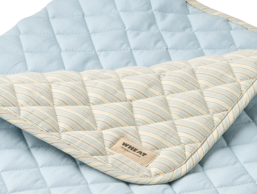 Quiltet tæppe i blå nuance fra Wheat. Tæppet har en ensfarvet quiltet forside og en bagside med klassiske striber, som giver et roligt og tidløst udtryk.