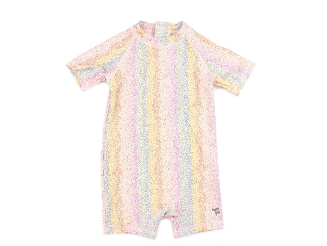 Badedragt med korte ærmer og ben med printet rainbow flowers fra Wheat.