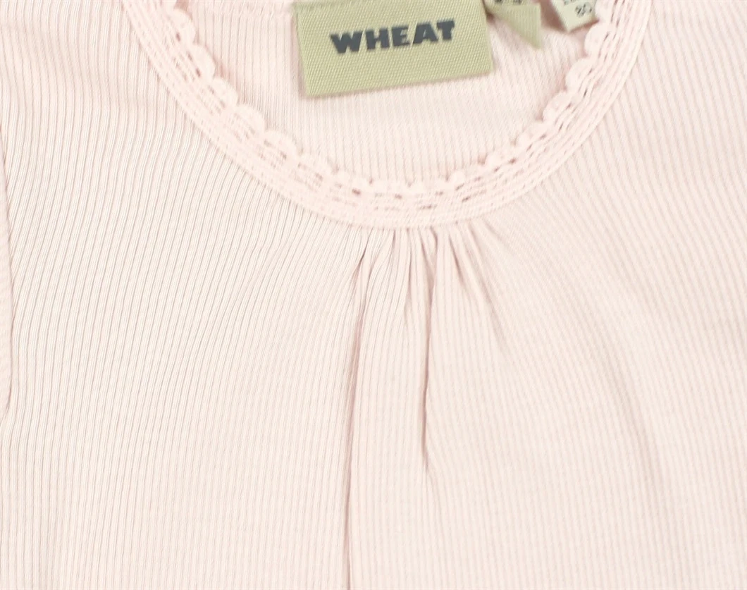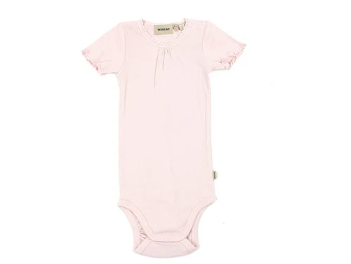 Kortærmet bodystocking i rib i farven rose ballet med blondekant i halsåbning fra Wheat.