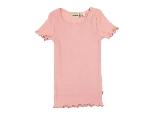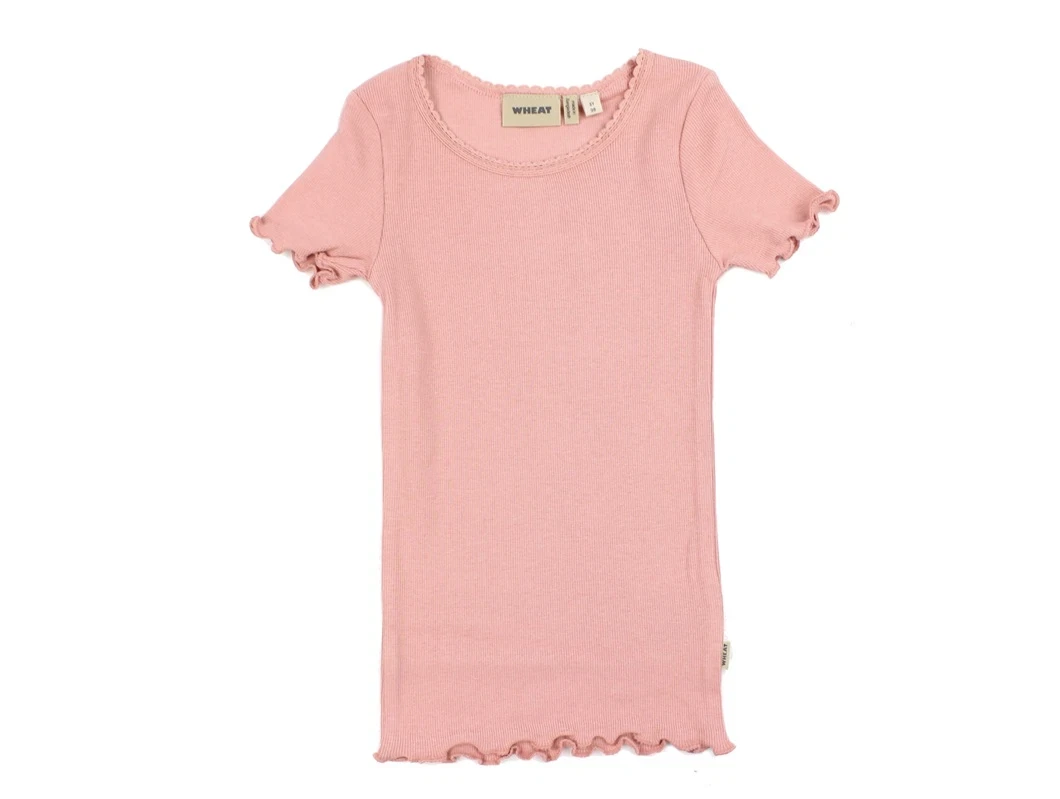 Kortærmet t-shirt i rib og med blondekant i farven rosette fra Wheat.