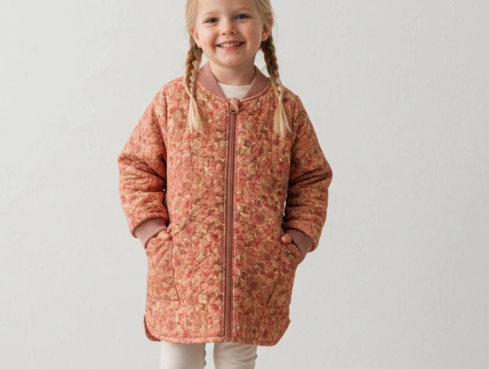 Lang termojakke med blomsterprint fra Wheat. Jakken har to lommer og ribkant på ærmerne.