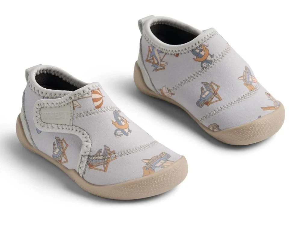 Badesko/strandsko i lyseblå med svømmeprint (swim club) fra Wheat.