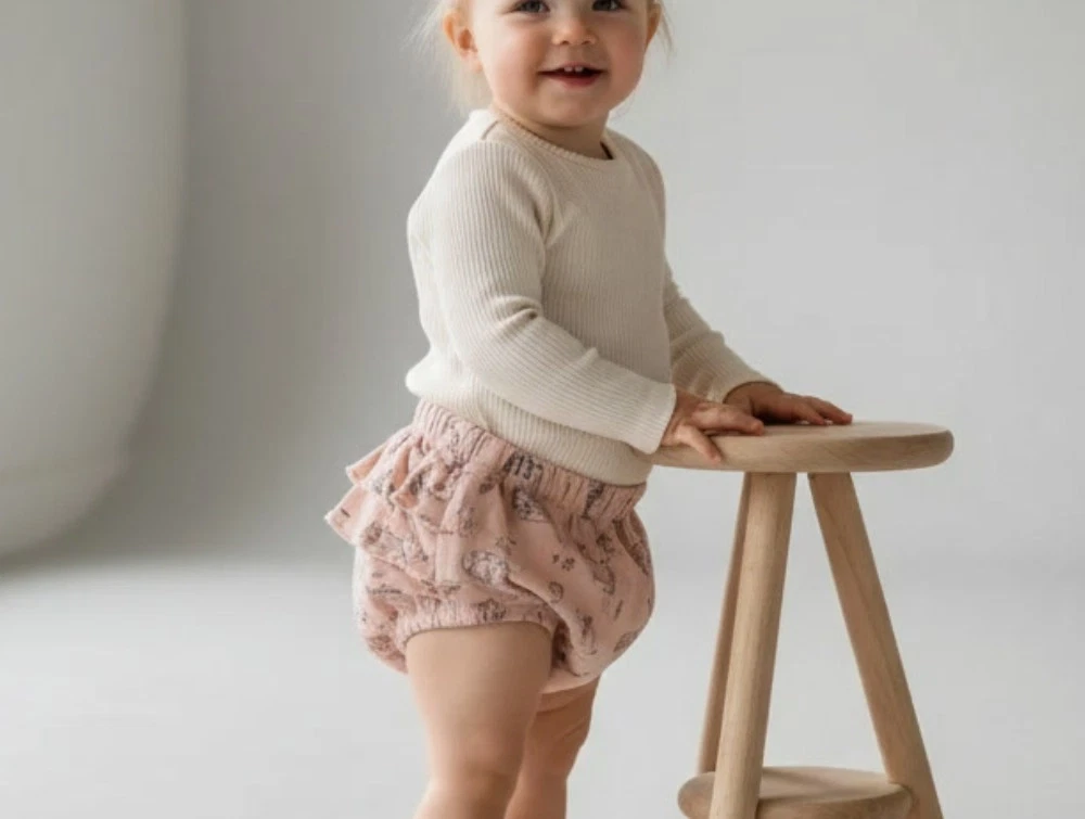 Pudderfarvede shorts/underbukser med Peter Plys-print og flæser på numsen fra Wheat.