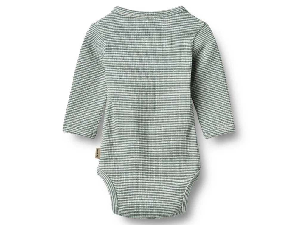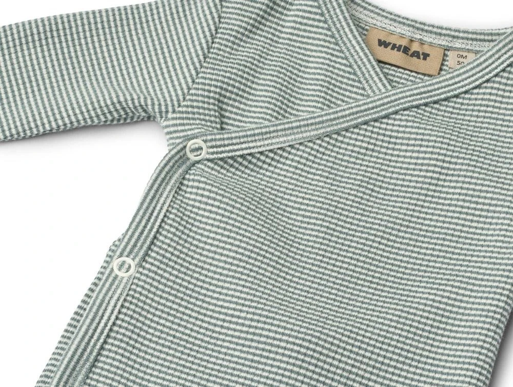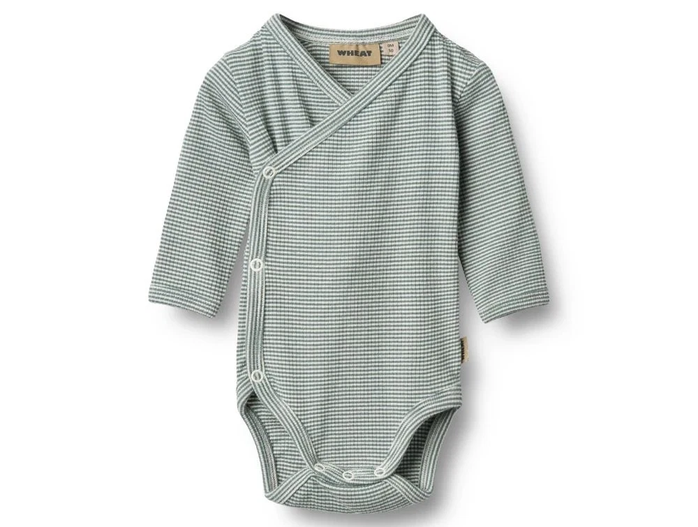 Blød og behagelig wrap-body fra Wheat i en fin ribstrikket kvalitet med striber i blågrøn (stormy sea) og hvid. Fremstillet i økologisk bomuld med stræk, der sikrer en behagelig pasform og høj komfort.
