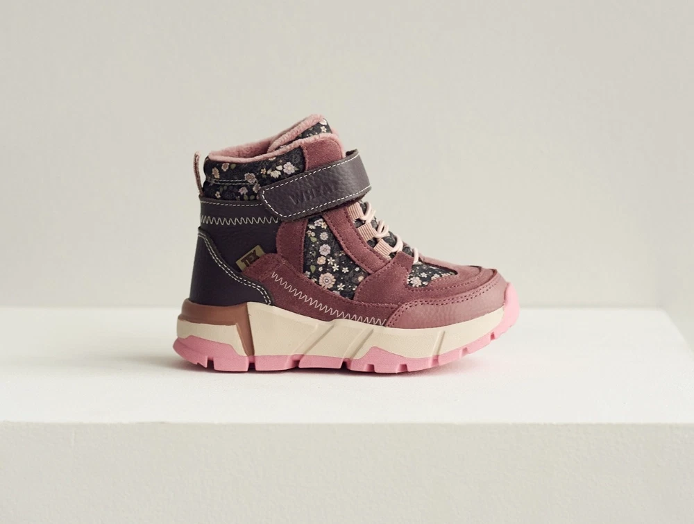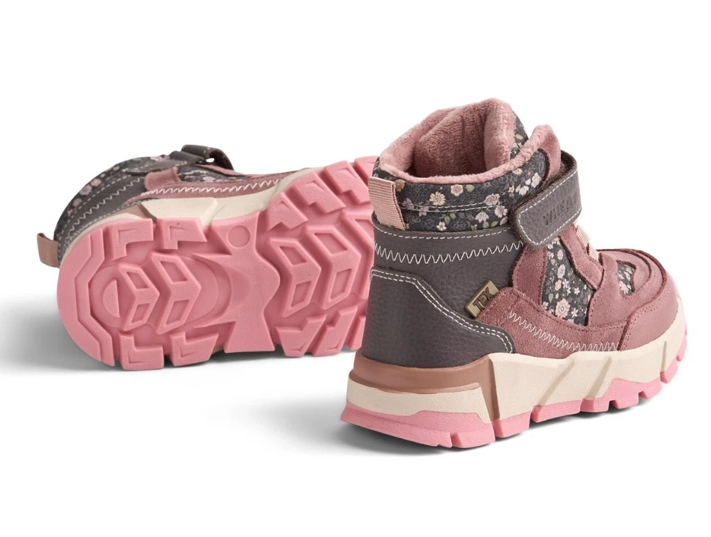 Bootie Muni Tex vintersneaker i rosa/lilla nuancer fra Wheat. En sporty mid cut model i nubuck og nylon med blomsterprint. Indvendigt er skoen foret med blødt fleece, som giver komfort og varme i de køligere måneder.