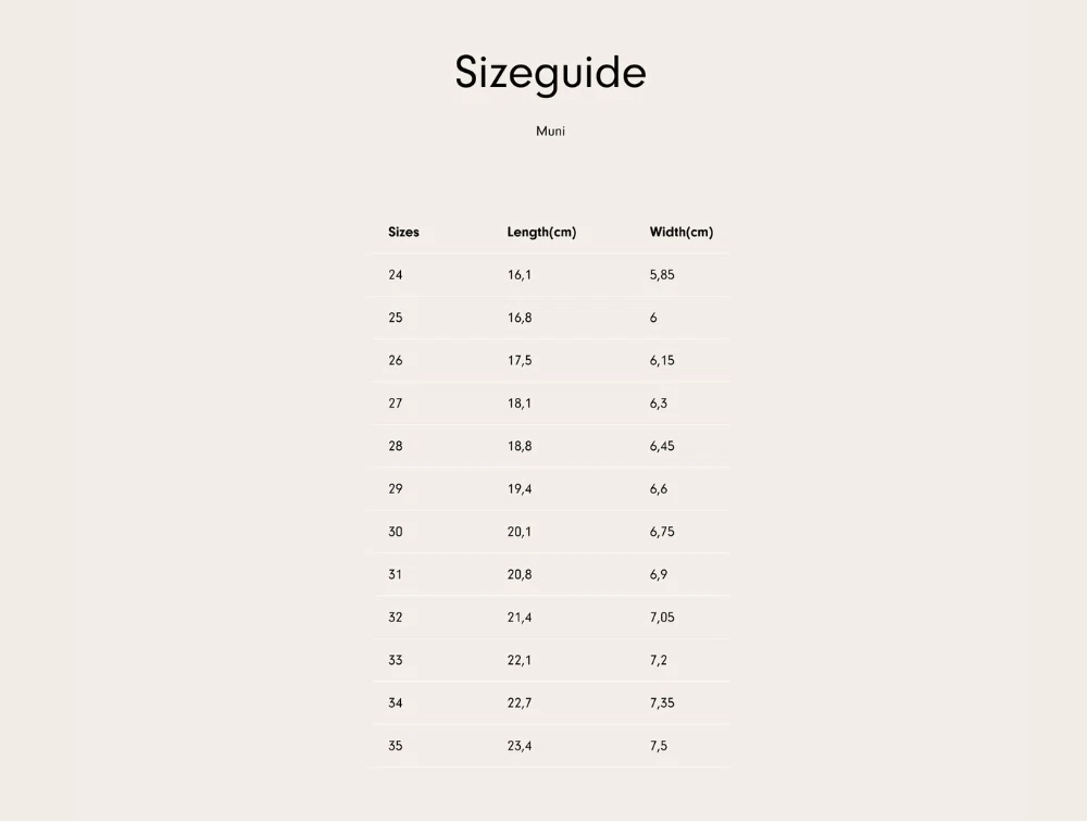 Pasformen vurderer vi til medium til bred, og vi ser Muni som et godt valg, hvis du ønsker en overgangsstøvle/ let vinterstøvle til dit barn. Hos MilkyWalk anbefaler vi et voksetillæg i vintersko som disse på ca. 1,3-1,8 cm. Vælger du 1,8 cm, giver det ekstra plads til lidt tykkere uldsokker og længere brugstid, især hvis støvlerne købes tidligt på sæsonen.