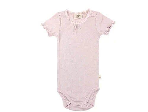 Kortærmet body i rib i farven soft lilac med blondekant fra Wheat.