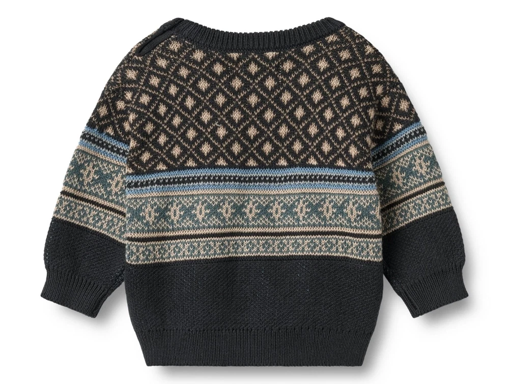 Wheat striktrøje navy med jacquardmønster og skulderknapper set forfraWheat striktrøje navy med jacquardmønster og skulderknapper set bagfraBaby med Wheat striktrøje navy med jacquardmønster og skulderknapperBaby iført Wheat striktrøje navy med jacquardmønster og skulderknapper