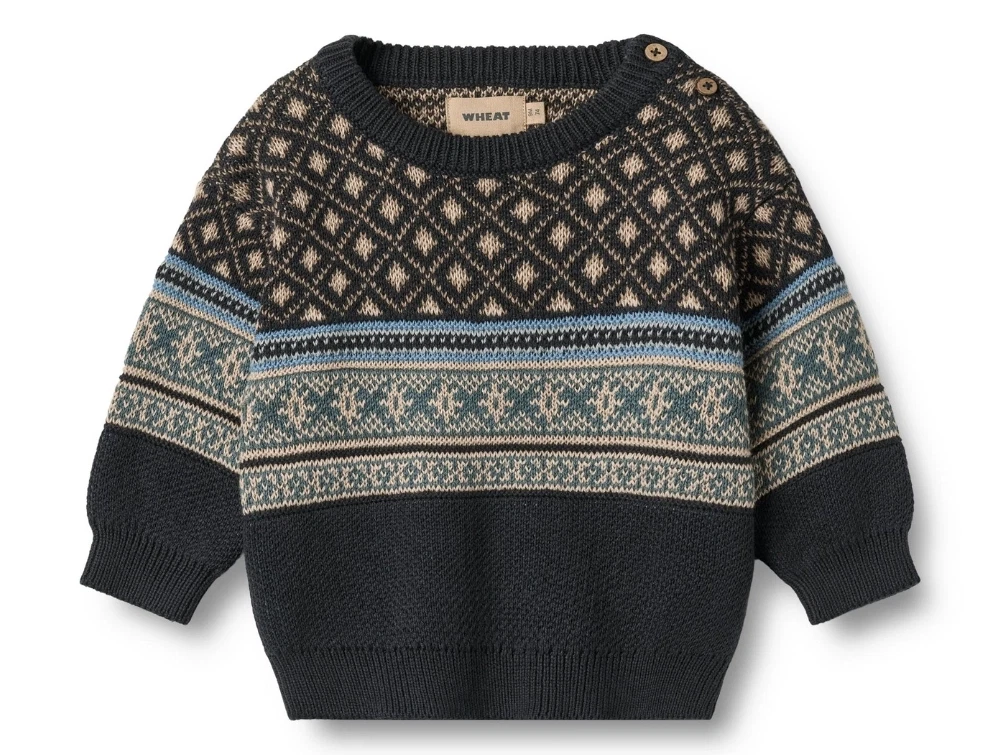 Wheat striktrøje i mørkeblå med jacquardmønster og skulderknapper