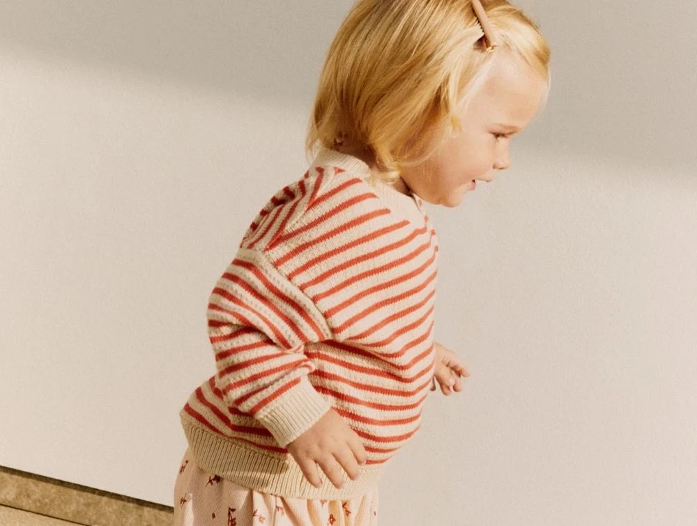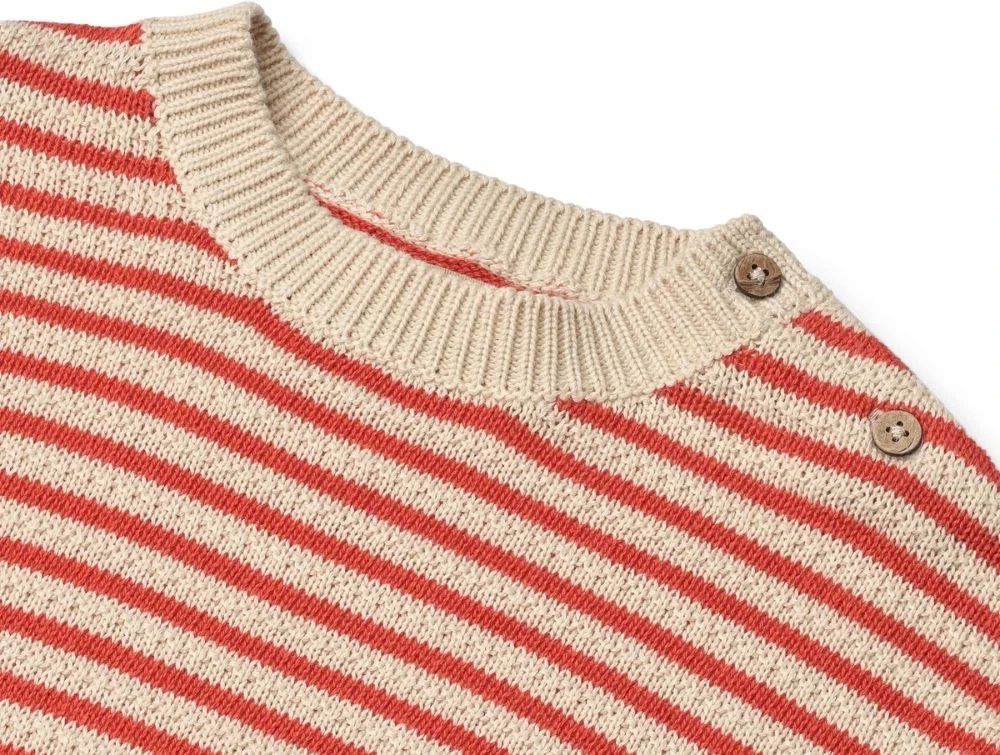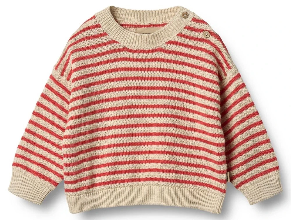 Blød langærmet bomuldsstrik fra Wheat i en lys varm sandfarvet nuance med klassiske røde striber. Den lette struktur og afslappede pasform giver et tidløst udtryk, der passer til både hverdag og særlige anledninger.