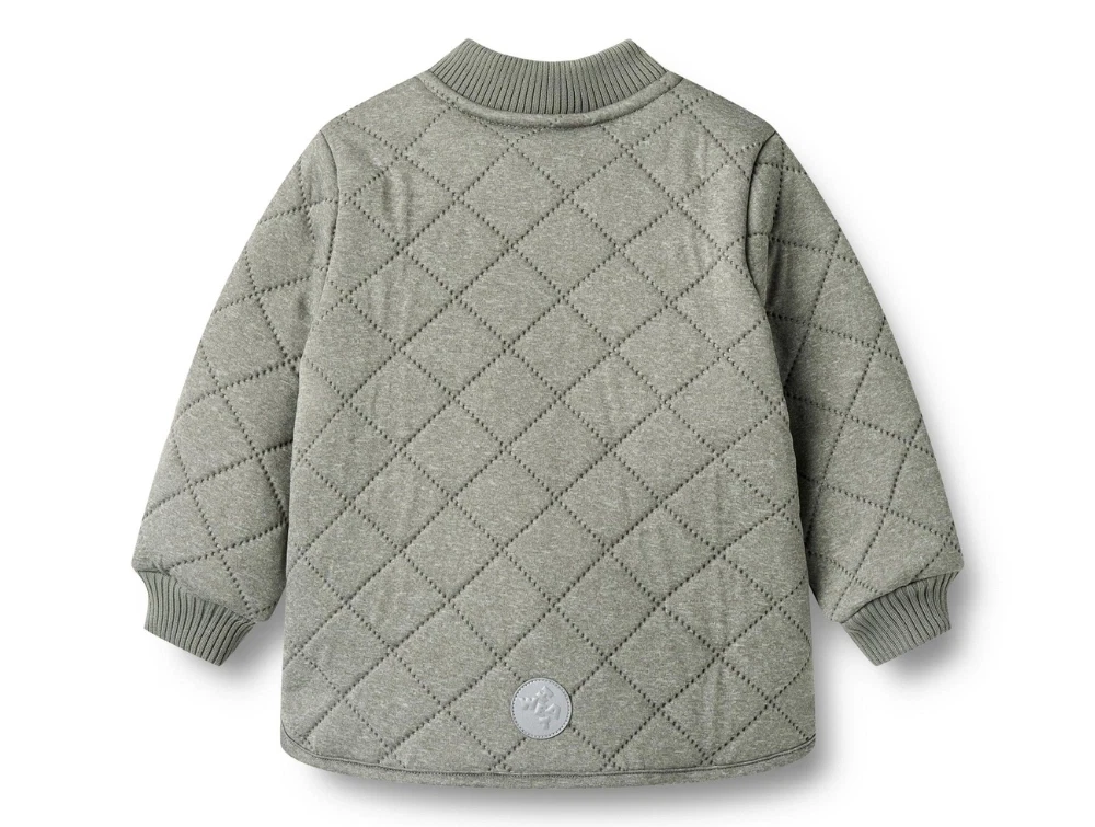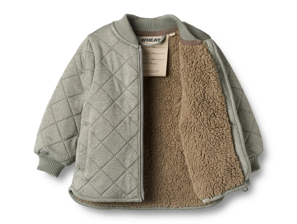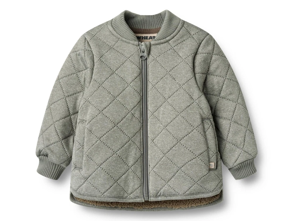 Termojakke i støvet grøn meleret nuance fra Wheat med quiltet yderside og blødt, isolerende foer indvendigt.