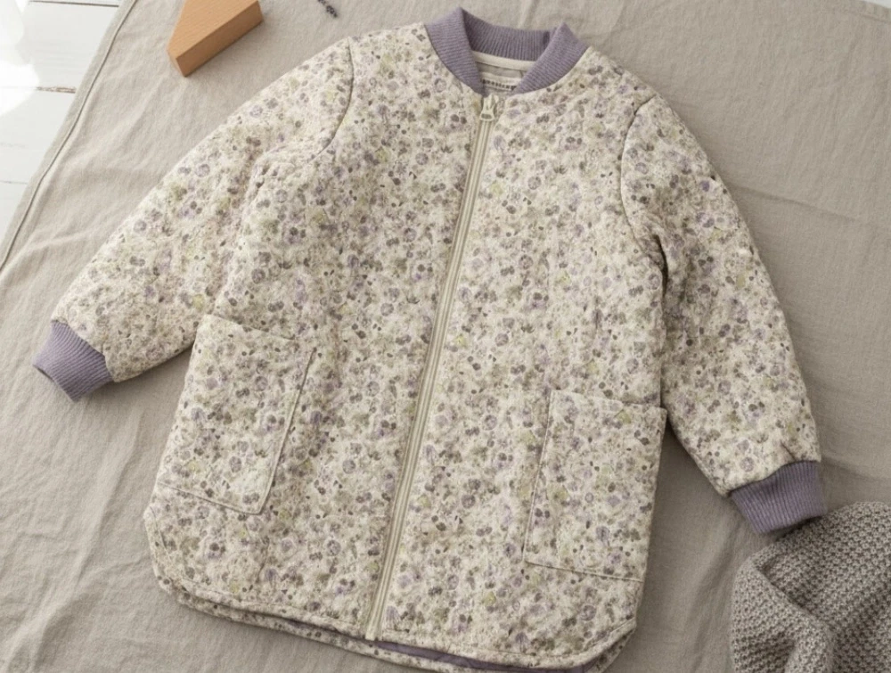 Lang termojakke med print fra Wheat. Jakken har to lommer og ribkant på ærmerne.