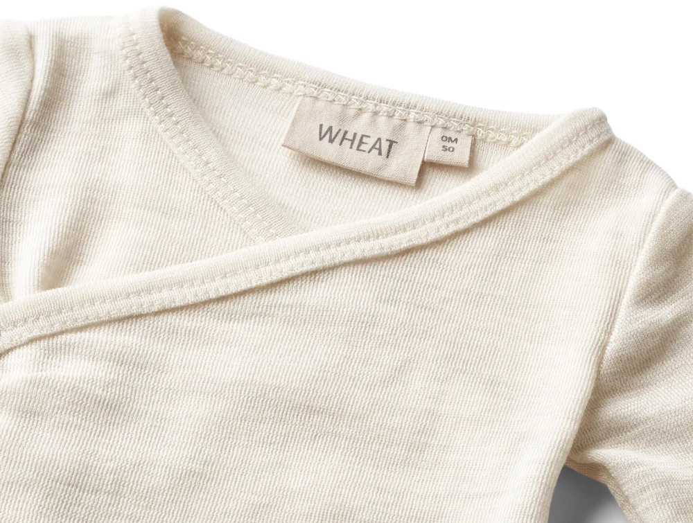 Uldbody i meleret råhvid (eggshell melange) fra Wheat. Praktisk slå-om lukning og lange ærmer.