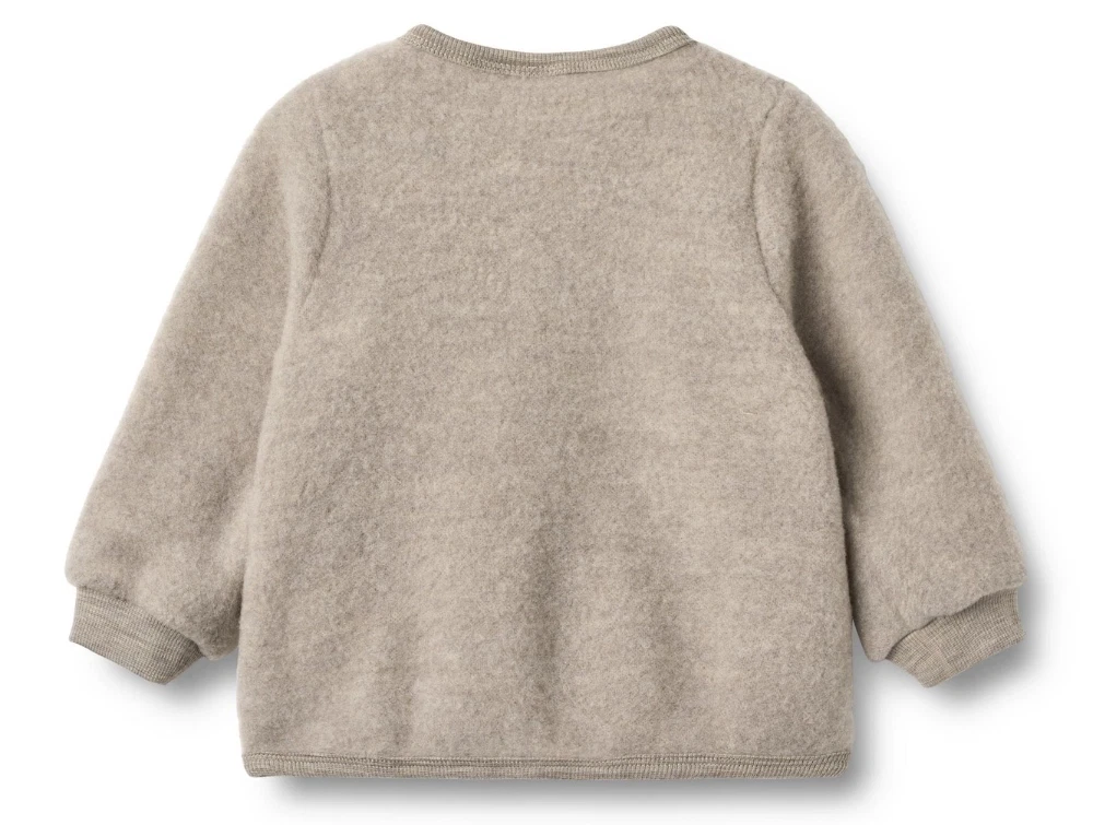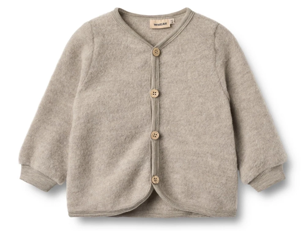 Cardigan i beige meleret (khaki melange) fra Wheat med knaplukning og blød uldfleece kvalitet.