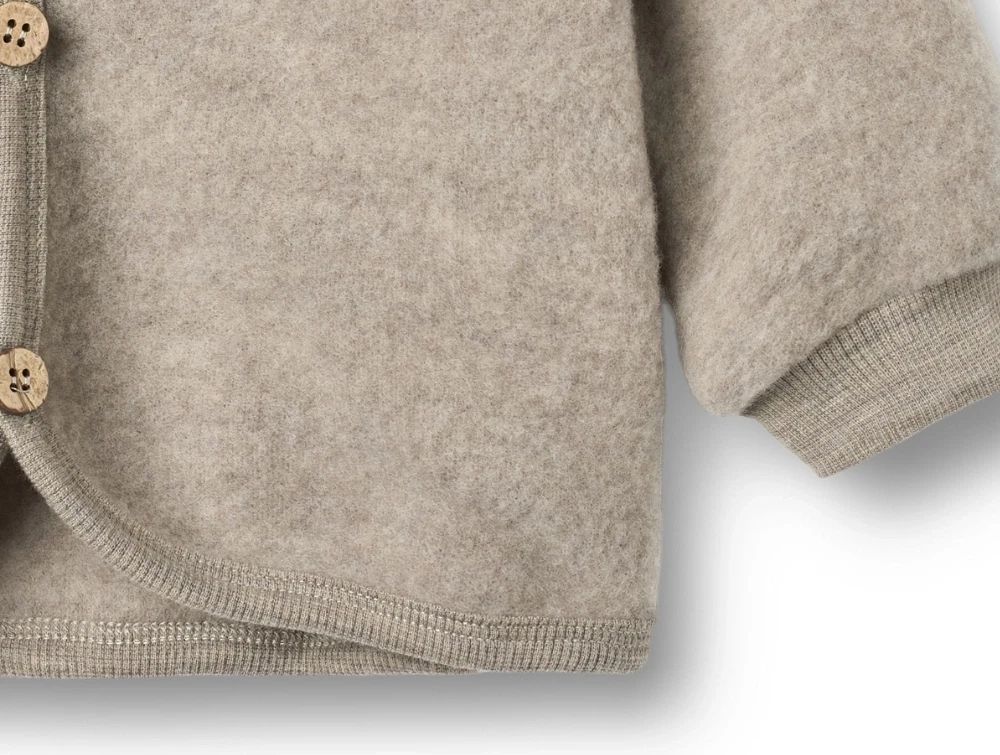 Wheat Wool fleece cardigan khaki melange med knaplukning set forfraWheat Wool fleece cardigan khaki melange med knaplukning set bagfraNærbillede af Wheat Wool fleece cardigan khaki melange med knaplukning