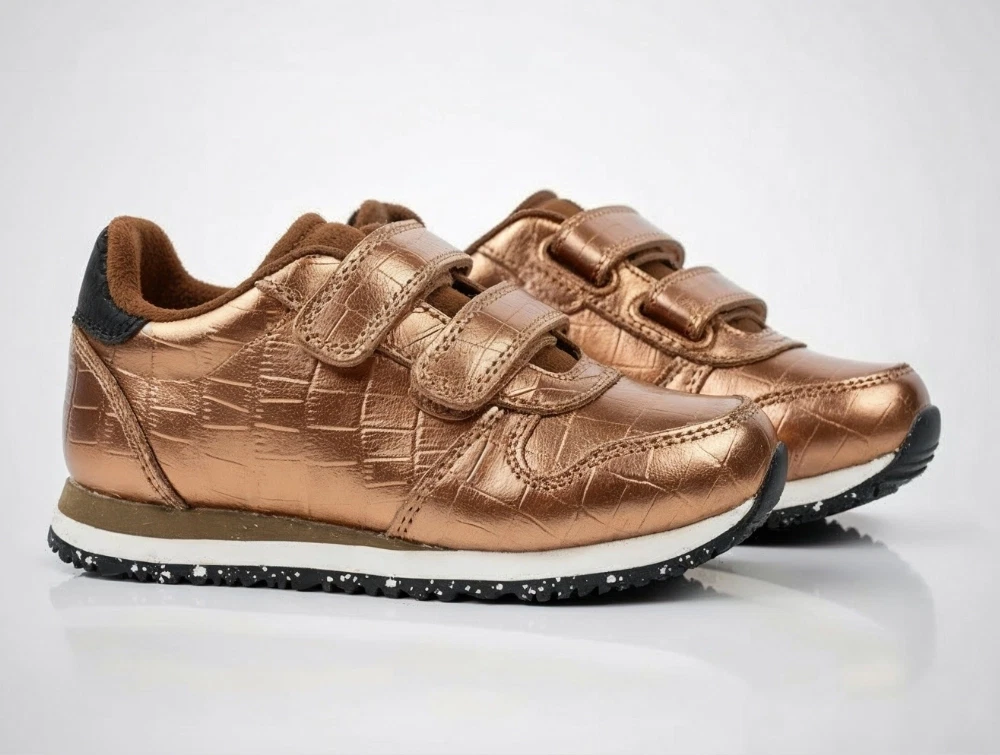 Sneakers i farven burnished copper fra Woden. Skoene lukkes nemt med velcro.