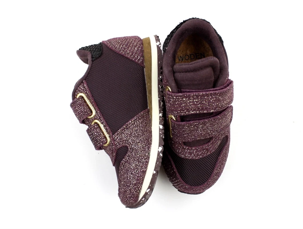Sneakers i farven fudge med glimmer fra Woden. Skoene lukkes nemt med velcro.