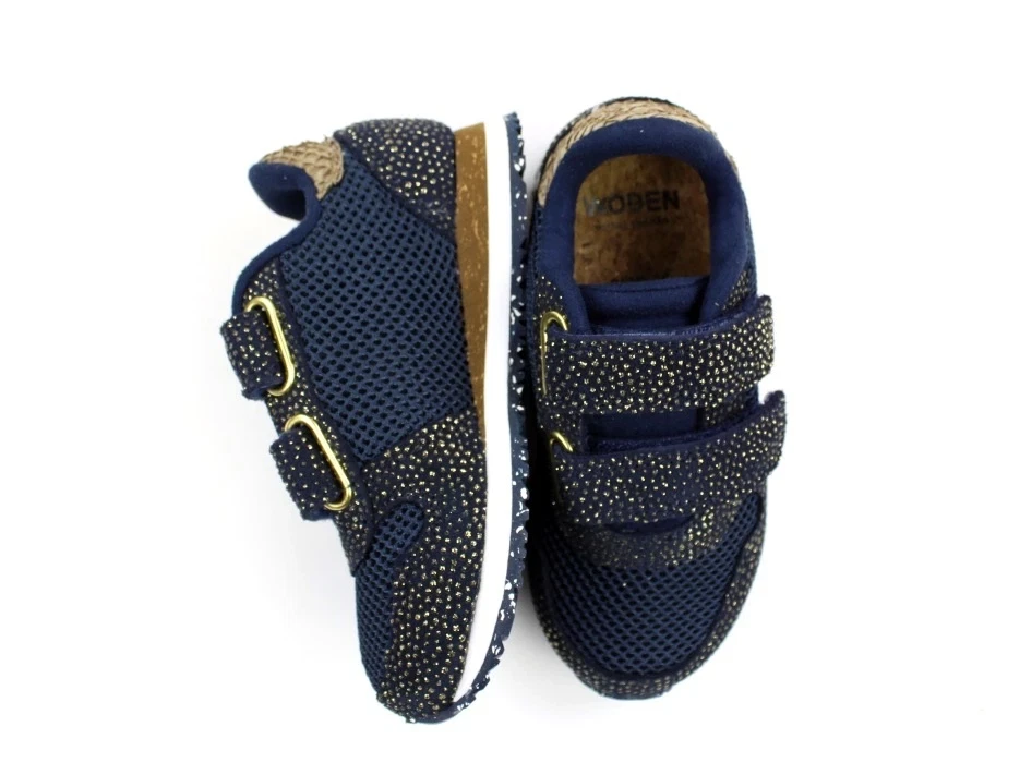 Navyfarvede sneakers med guld-glimmer fra Woden. Skoene lukkes nemt med velcro.