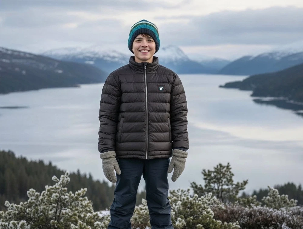 Jakken lukkes med lynlås, har to skrålommer med trykknap og et lille rundt Wood Wood double A-patch.