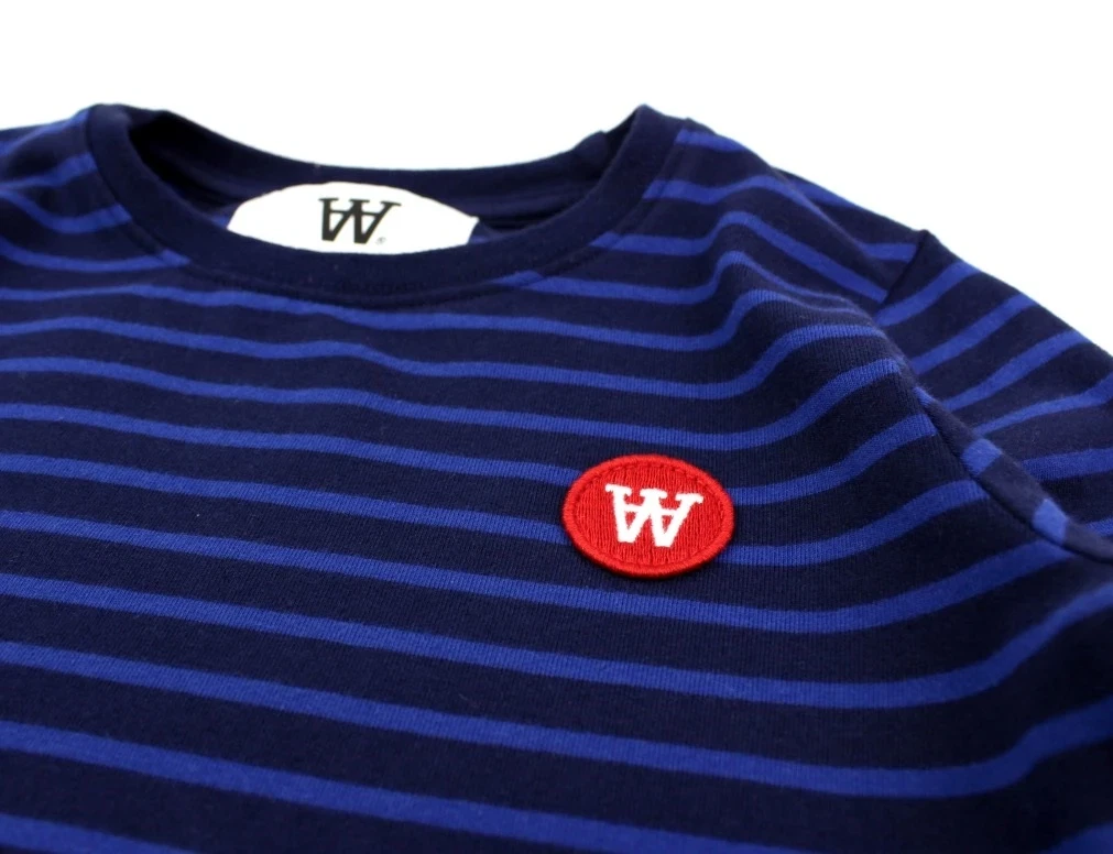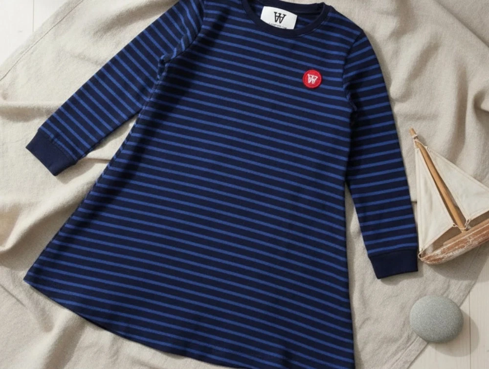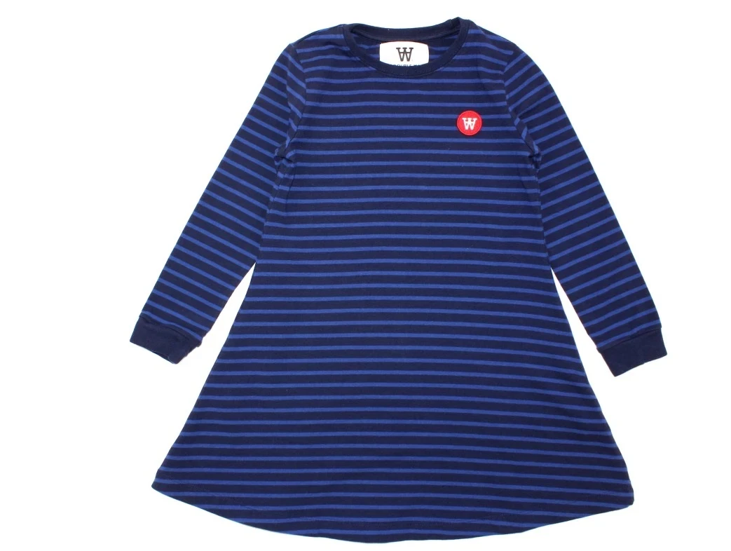 Navyfarvet kjole med blå striber og dobbelt A patch på venstre bryst fra Wood Wood.