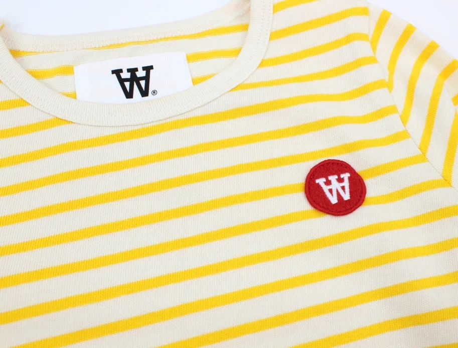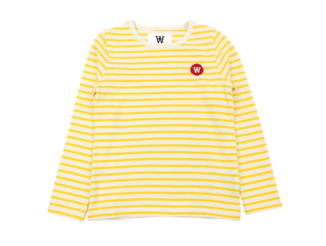 Råhvid bluse med gule striber og dobbelt A patch på venstre bryst fra Wood Wood.