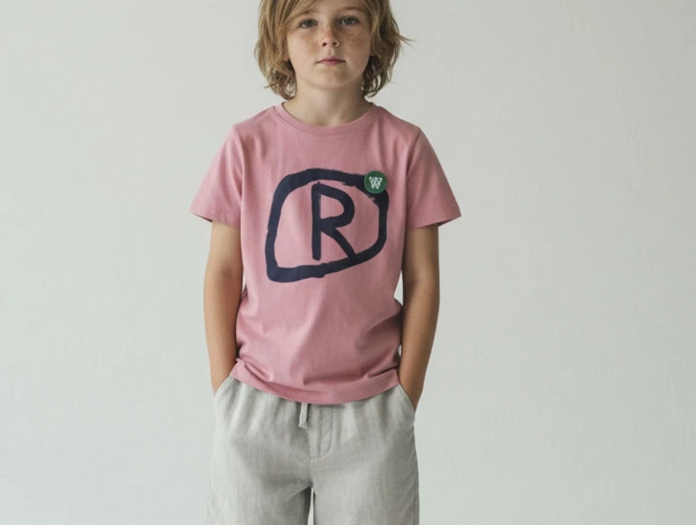 Rosa t-shirt med grønt dobbelt A patch og håndtegnet print fra Wood Wood.
