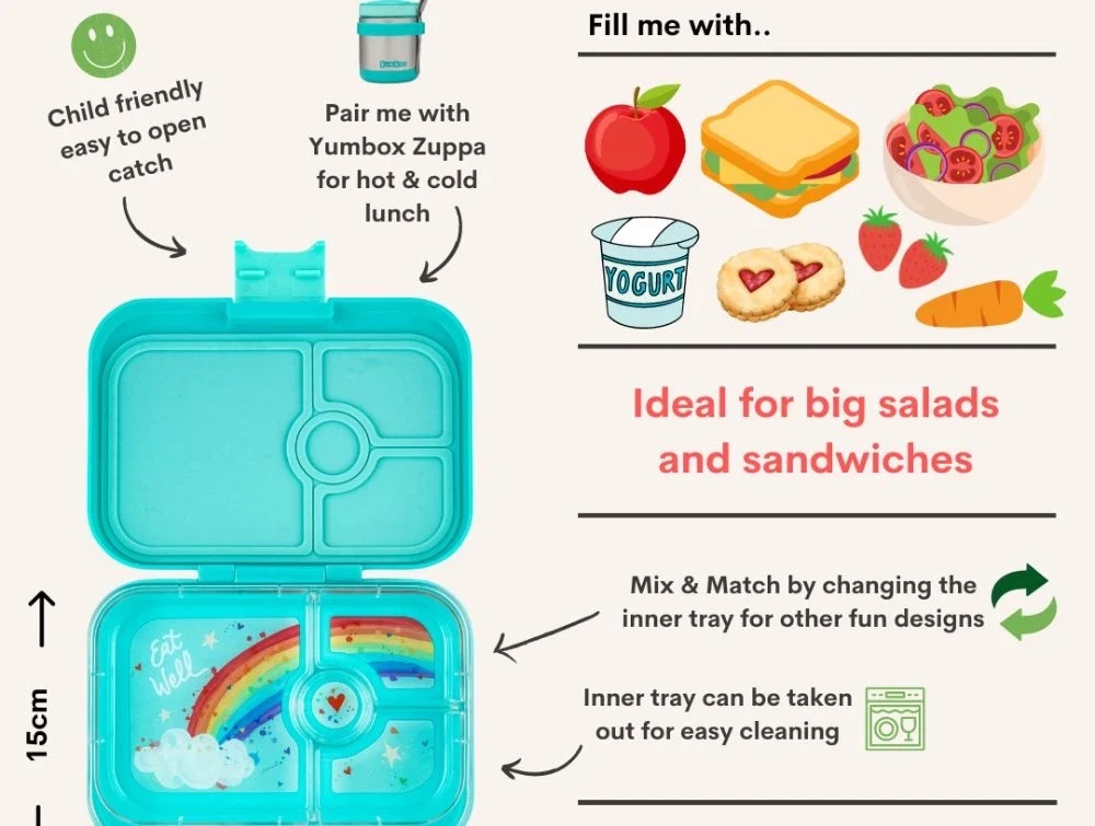 Yumbox Panino børnemadkassen er ideel til vuggestue, børnehave, skole og udflugter. Det smarte, børnevenlige design og de praktiske opdelinger gør det let at pakke en varieret og frisk frokost til dit barn.