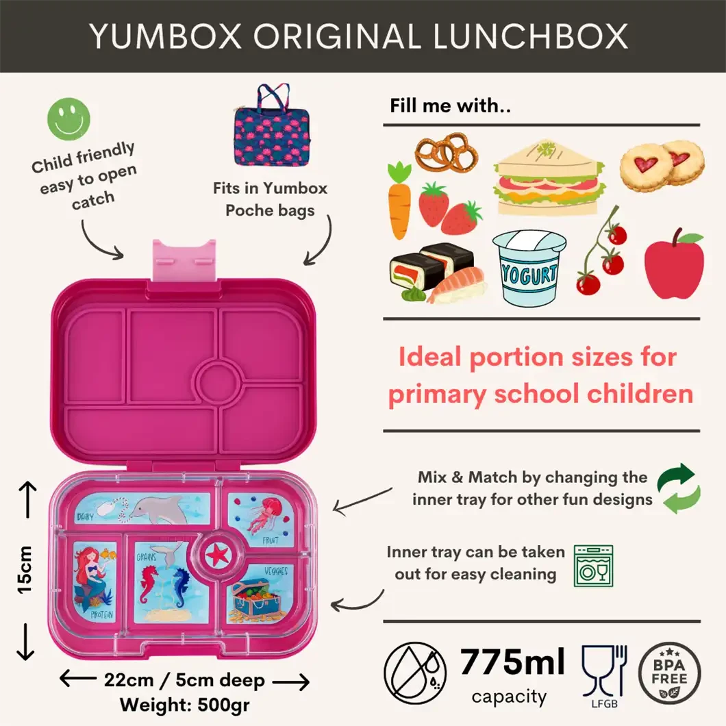 Yumbox Original børnemadkassen er ideel til vuggestue, børnehave, skole og udflugter. Det smarte, børnevenlige design og de praktiske opdelinger gør det let at pakke en varieret og frisk frokost til dit barn.