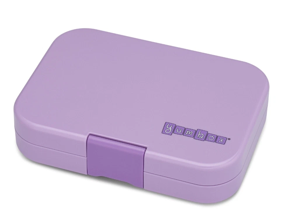 Yumbox Panino madkasse i lavendel lilla med åben låg og unicornprint i inderbakkenYumbox Panino madkasse i lavendel lilla med lukket låg og logo
